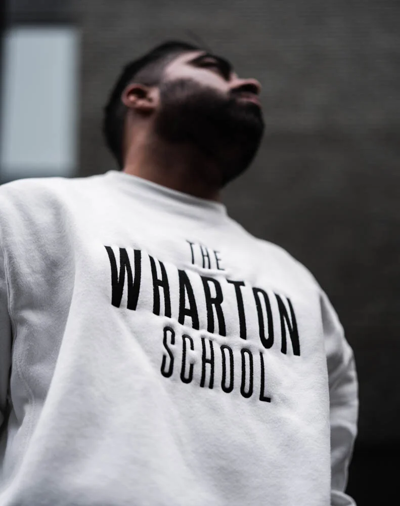 “The Wharton School” is featured boldly across the chest while a modern, monochrome version of the University of Pennsylvania coat of arms has been subtly stitched to the right sleeve as a reflection of the school’s relationship to its parent university.